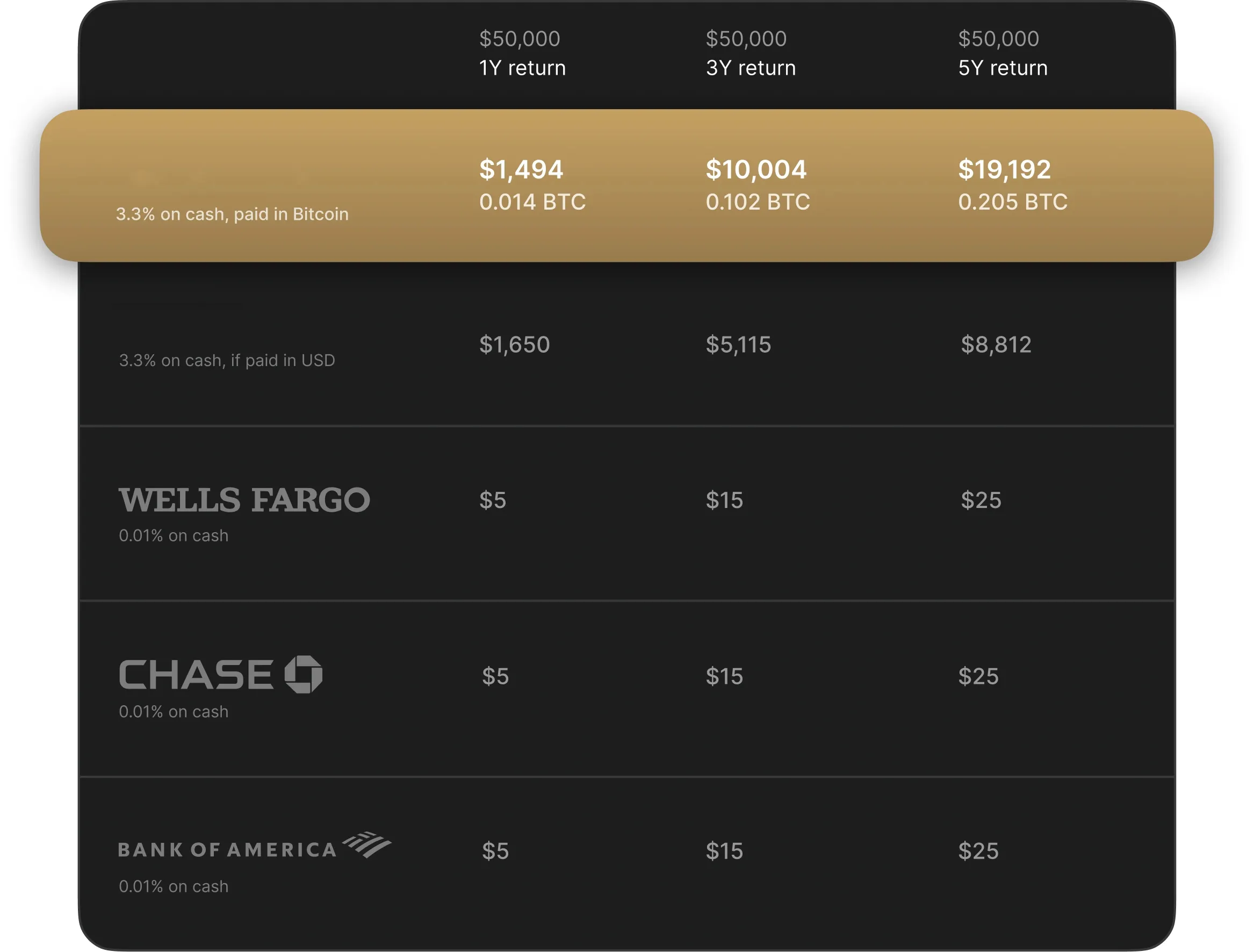 The table is for illustrative purposes only. It compares estimated yields and annual earnings calculated from: the yield as of 10/07/2024 of a Bitcoin interest on cash offered by us, and the APY offered by other service providers as found on their websites (data correct as of 10/08/2024 for - Way2Save®, Chase Savings℠, and Bank of America Advantage Savings). Yields will fluctuate over time, and are not a forecast or guarantee of future earnings.